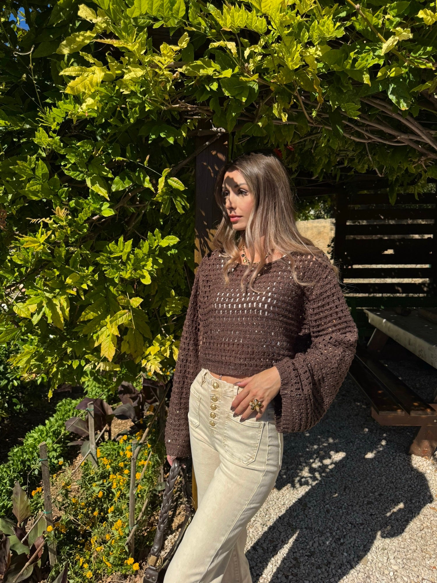 Délicatement scintillant, ce petit pull ajouré apporte une touche de féminité à votre silhouette. Son jeu de mailles ajourées laisse deviner juste ce qu’il faut, tandis que les fines paillettes subtilement intégrées au fil captent la lumière à chaque mouvement. Parfait pour illuminer vos tenues de jour comme de soirée, il se porte aussi bien sur un jean casual que sur une jupe élégante. Une pièce douce, raffinée et pleine de charme.